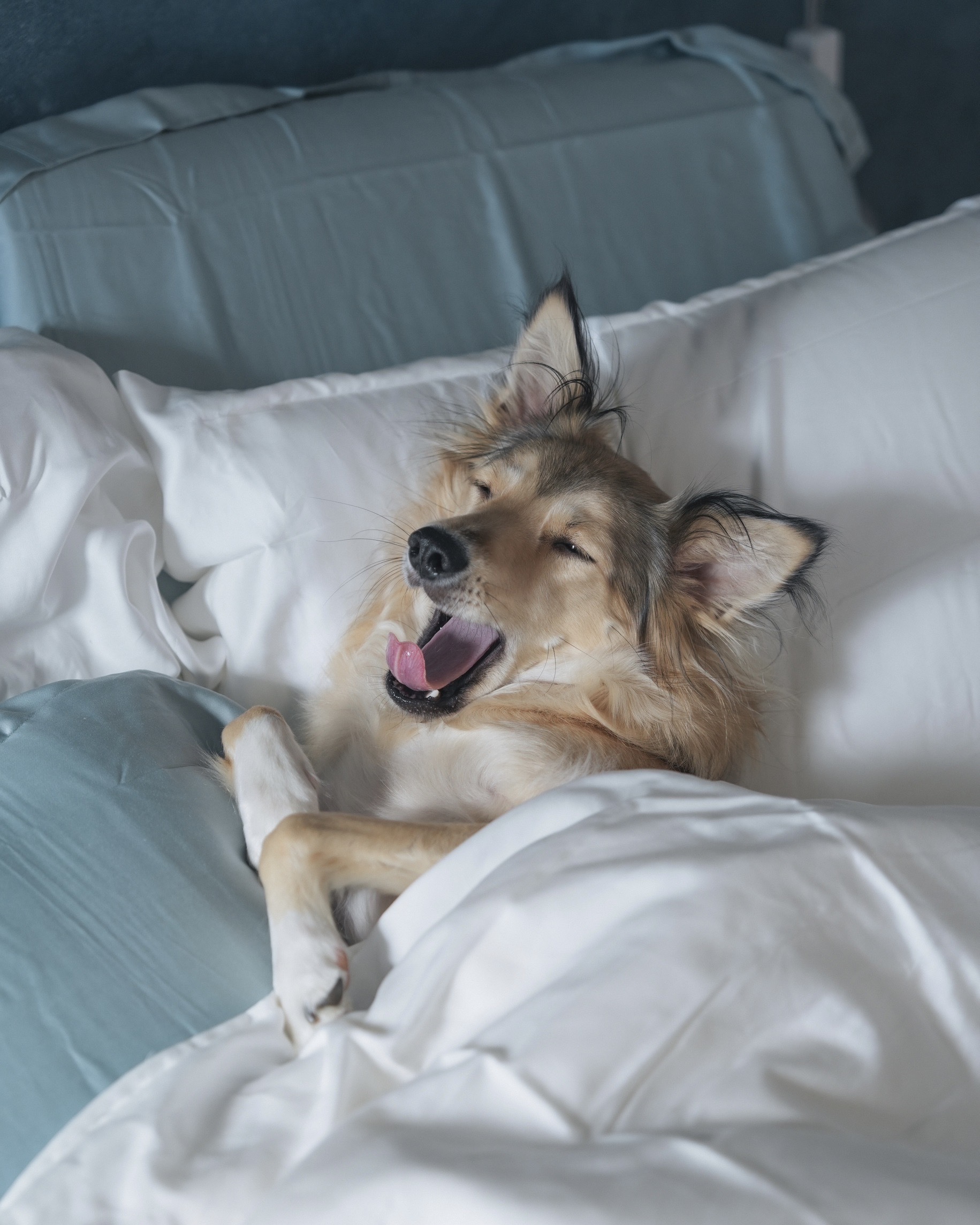 是度假休閒與日常感的平衡 至於𝟲𝟬支天絲的滑順感跟吸濕透氣 就要自己摸摸看躺躺看才能體會了 不過看薑薑已經徹底攻佔我們的床 就知道躺起來有多舒適了吧!