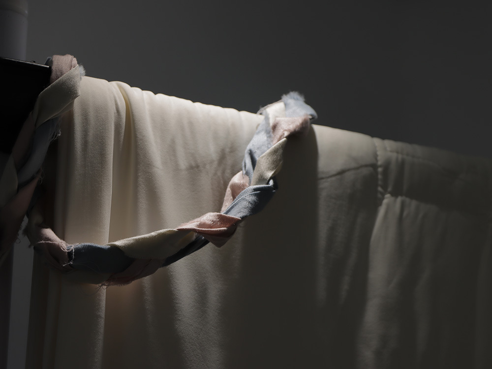 直立的衣架纏繞著細長布條, 大面積布料披覆其上,化身為層疊有序的樹幹與枝葉。