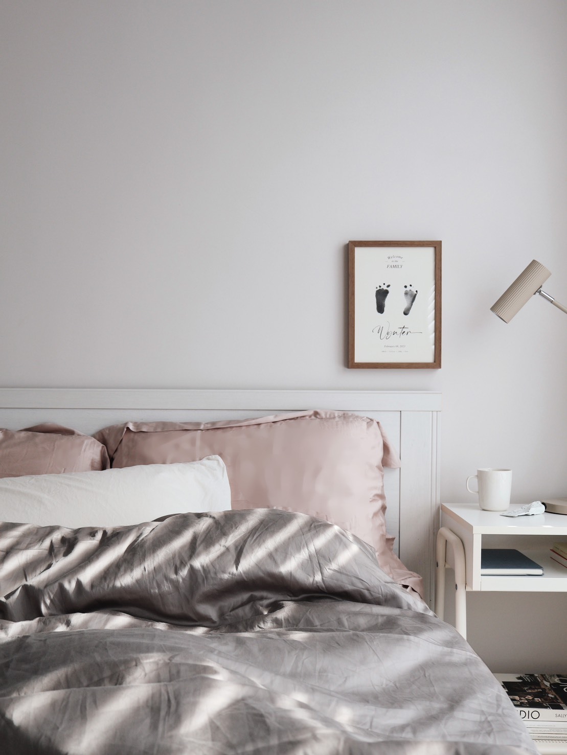 我們家的第一套天絲寢具是安庭家居的60支天絲,當時選了粉色系,意外發現滿適合作為我們的臥室色調,可惜舊家的床規與新家不同,所以這次挑選他們家的新品-天絲棉,再度選了粉色系,是「淺石灰 x 灰霧粉」的搭配,因為臥室太小,寢具就會直接成為主色調。