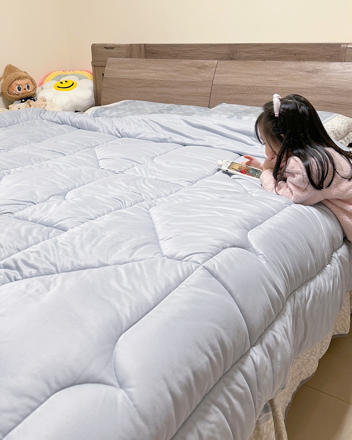 精緻的滾邊和雙色設計,正反面都能蓋,也能搭配床包打造不同的風格,四角還有綁耳固定線,套入被套也ok,但我覺得直接蓋就很舒服~
