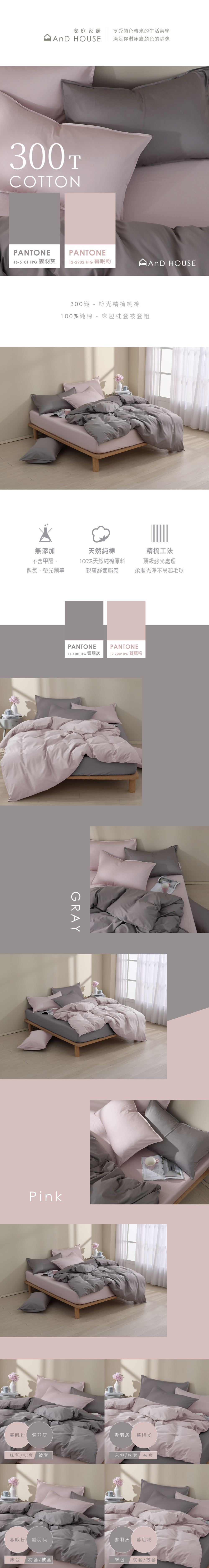 300織精梳純棉|100%純棉|雙色配|雲羽灰x暮眠粉