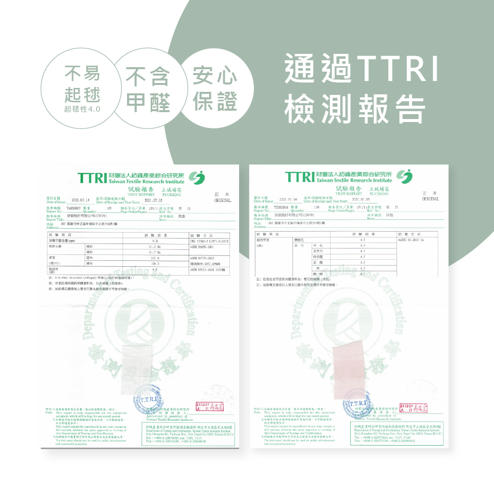 6.通過SGS及台灣紡織研究所檢驗TTRI檢測結果 : 不含甲醛、游離性螢光劑、偶氮、鉛等相關有害物質。